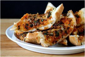 - In a small bowl, combine the Parmesan cheese, parsley, and paprika. Sprinkle the mixture over the butter coated surface of the bread.