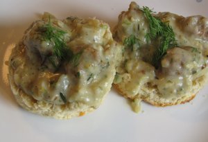 Cut biscuit to half, cover the halves with gravy. Sprinkle chopped dill on top for garnish and enjoy!