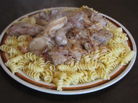 Add sour cream and meat, let it warm thru for 1 minute and serve on top of the noodles.