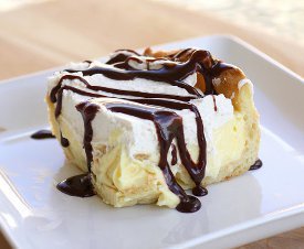 We love chocolate eclairs in our household, and I was really pleased to come across this recipe. I can see my wife and I polishing off the entire dish in the course of an evening. Do click through for the recipes for homemade chocolate sauce and whipped cream. They're both good and contain some useful hints for making them.