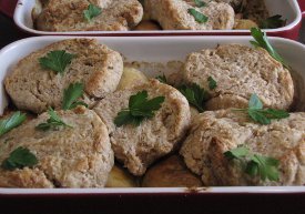 Transfer filling to oven safe dish and cover it with biscuits. Bake in oven for 15 minutes or until biscuits are fluffy and start to get color.