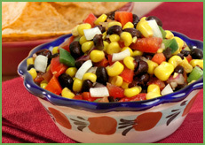 In large mixing bowl, combine corn, green peppers, red peppers, red onion, black beans, garlic and tomatoes.