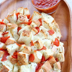 Bloomin Pizza BreadFri Jul by Christy The Girl Who Ate Everything Literally as soon as I took the Bloomin Onion Bread out of the oven my mind started racing of all the different possibilities and ways I could make this style of bread Im always thinking of entertaining so the concept of a bread that everyone can just pull off and eat is interactive and perfect for company My first thought was a pizza infused bread because thats always a crowd favorite and thats how this baby was born So this weekend take a warm piece of sourdough bread glazed with Parmesan and garlic butter oozing with melted cheese and pepperoni and dip it in warm pizza sauce Yum PrintBloomin Pizza Bread Ingredients unsliced round loaf sourdough bread - ounces mozzarella or Provolone cheese thinly sliced ounce package pepperoni halved Tablespoons butter melted teaspoon garlic powder teaspoon Italian seasonings Tablespoons Parmesan…Read More cheese pizza marinara sauce for dipping Instructions Preheat oven to degrees Cut the bread lengthwise and widthwise without cutting through the bottom crust This can be a little tricky going the second way but the bread is very forgiving Place bread on a foil-lined baking sheet and insert cheese slices and pepperoni between cuts Combine butter garlic powder and Italian seasonings Drizzle or brush over bread with a pastry brush Sprinkle bread with Parmesan cheese Wrap bread completely in foil and bake at degrees for minutes Unwrap the bread and bake more minutes or until cheese is melted and pepperoni is a little crispy Notes Source The Girl Who Ate Everything inspired from The Changeable Table