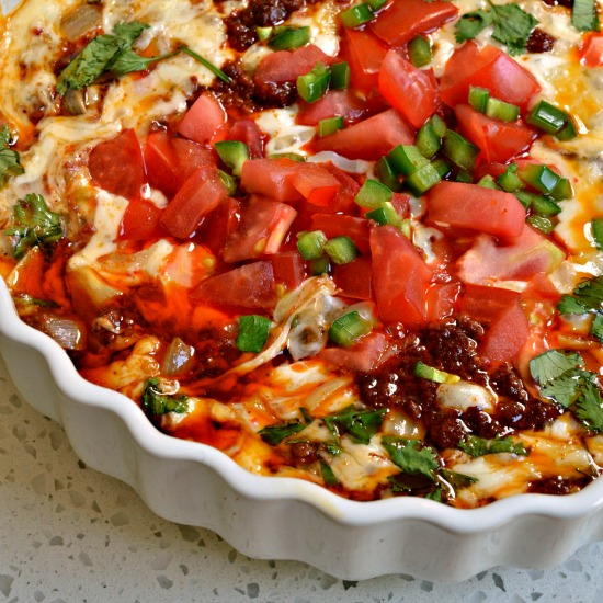 "Queso Fundido is a Mexican dip with creamy melted cheese, chorizo, spices and your choice of toppings served with tortilla chips or tortillas. It is absolutely delicious and so flavor packed. This beautiful hot mess is one of our favorite dips. It really is a cinch to make and can be prepped in advance of your celebration. You will find it difficult to stop eating this incredibly delicious treat. I like to top this dish with sun ripened tomatoes, minced jalapenos and fresh chopped cilantro. However you could also substitute or add thin sliced green onions and chopped avocado."