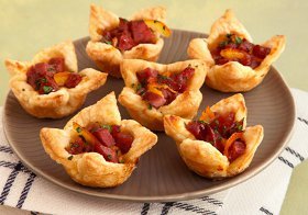 A perfect party food to serve as a game day snack, these Smokey Sausage Bites feature spicy sausage with a mouthwatering mustard sauce. Served in a flaky puff pasty cup, they are truly addictive. Don't just serve your guests chips and dip, go the extra mile and score a touchdown with these fantastic cute little bites. They'll be gone before you even know it.