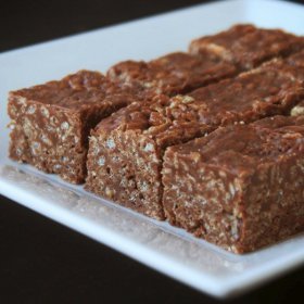 Spread the mixture into a greased 8x11 inch pan. Cut into squares when the bars are completely cool and set up.