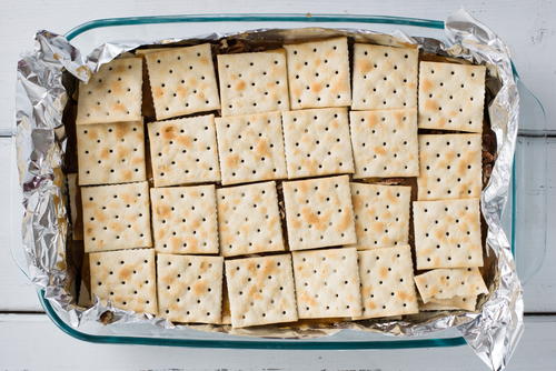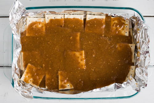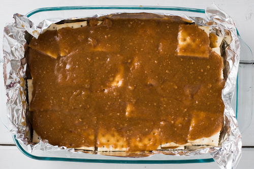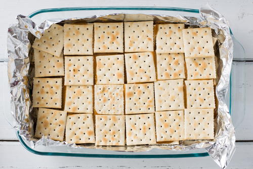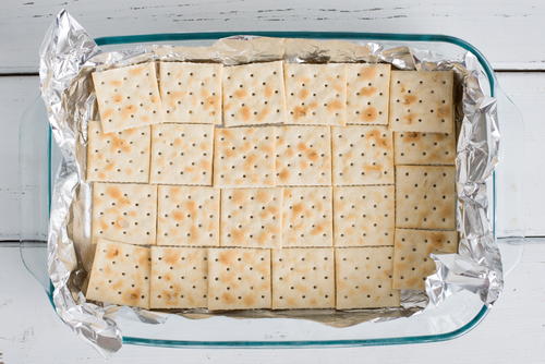 Place a layer of saltine crackers on the bottom of the pan. If you need to break the crackers in order to get them to fit evenly, that is fine.