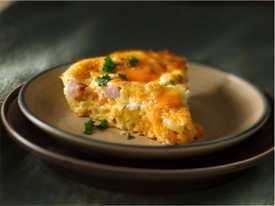 - Spray 10-inch or 9 1⁄2-inch glass deep-dish pie plate with cooking spray. In large bowl, mix 2 cups of the cheese, the ham and macaroni. Spread in pie plate.