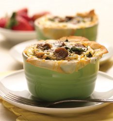 - Spray 6 custard cups or a standard muffin pan (6 oz capacity) with cooking spray. Line each cup with 3 layers of phyllo dough and spray with the butter cooking spray between each layer.