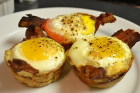 When I first looked at the photo, I thought this was a twist on the bacon bowls that are popular right now. It's similar, but until I read the recipe I didn't realize that flattened bread was the main part of the bowl. I didn't have whole wheat so I used some thicker rye bread and it turned out quite well. It's a delightful way to present the traditional bacon and eggs and toast. I love the idea below of a BLT in a cup.