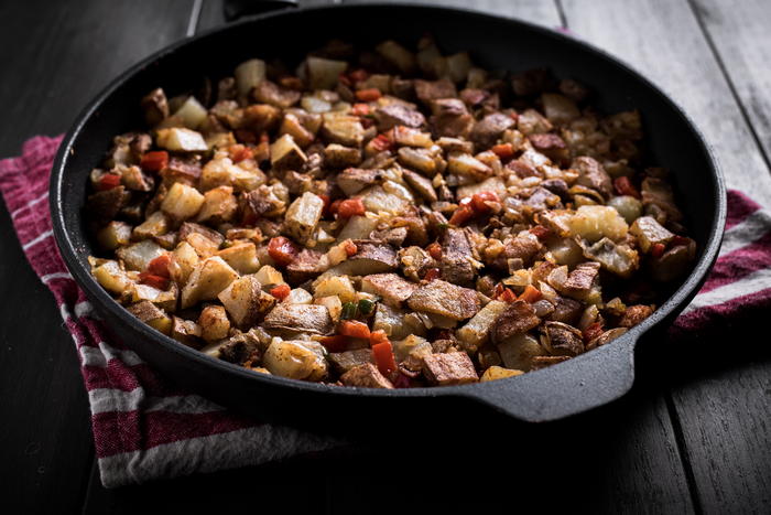 The classic way to make home fries is by combining diced or raw-cut potatoes, with finely diced onion and red or green pepper. We added some diced jalapeno for some added spice that will wake you up in the morning.
