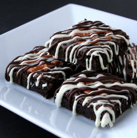 In two separate bowls, melt the white chocolate chips and semi sweet chocolate chips in the microwave. To each bowl, add 1/4 teaspoon vegetable oil. Stir until smooth. In two separate zipper bags, pour in the chocolates. Snip the end off of the white chocolate and drizzle over the brownies. (I like to do this after the brownies are cut while they are on a cooling rack hanging over the kitchen sink.) Finish off the brownies by drizzling them with the semi sweet chocolate.