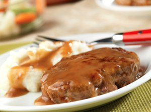 This is a delicious basic (old school) recipe, and quick enough for ladies on the go. I prefer to make my own gravy, so I made a basic roux and added low sodium beef broth and some sauteed (sliced) button mushrooms to it, and a sprinkle of garlic powder. I put the salisbury steaks on a serving platter and spooned the mushroom gravy over it. I topped the completed dish off with some chopped fresh parsley on top.