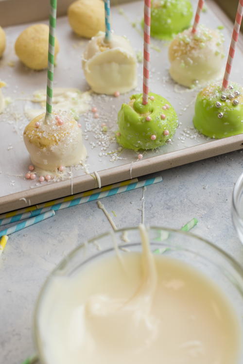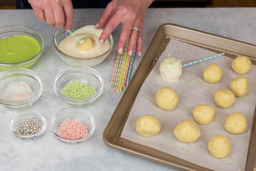 Remove only 2-3 cake balls from the refrigerator at a time. Dip a lollipop stick about 1/2 inch into the coating, then insert into the center or the cake ball. Only push it about halfway through the cake ball. Dip the cake ball into the coating until it is completely covered.