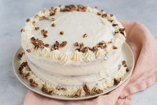 Spread about 1 cup of frosting evenly on top of the cake, then top the frosting with 3-4 tablespoons of the remaining pecans.