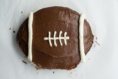 One of the things we love most about this recipe is that it's so easy! You do not need a football pan in order to make it. You don't even have to make the cake from scratch. As long as you have two round cake pans at home, all you need to do is pick up a chocolate cake mix and some frosting.