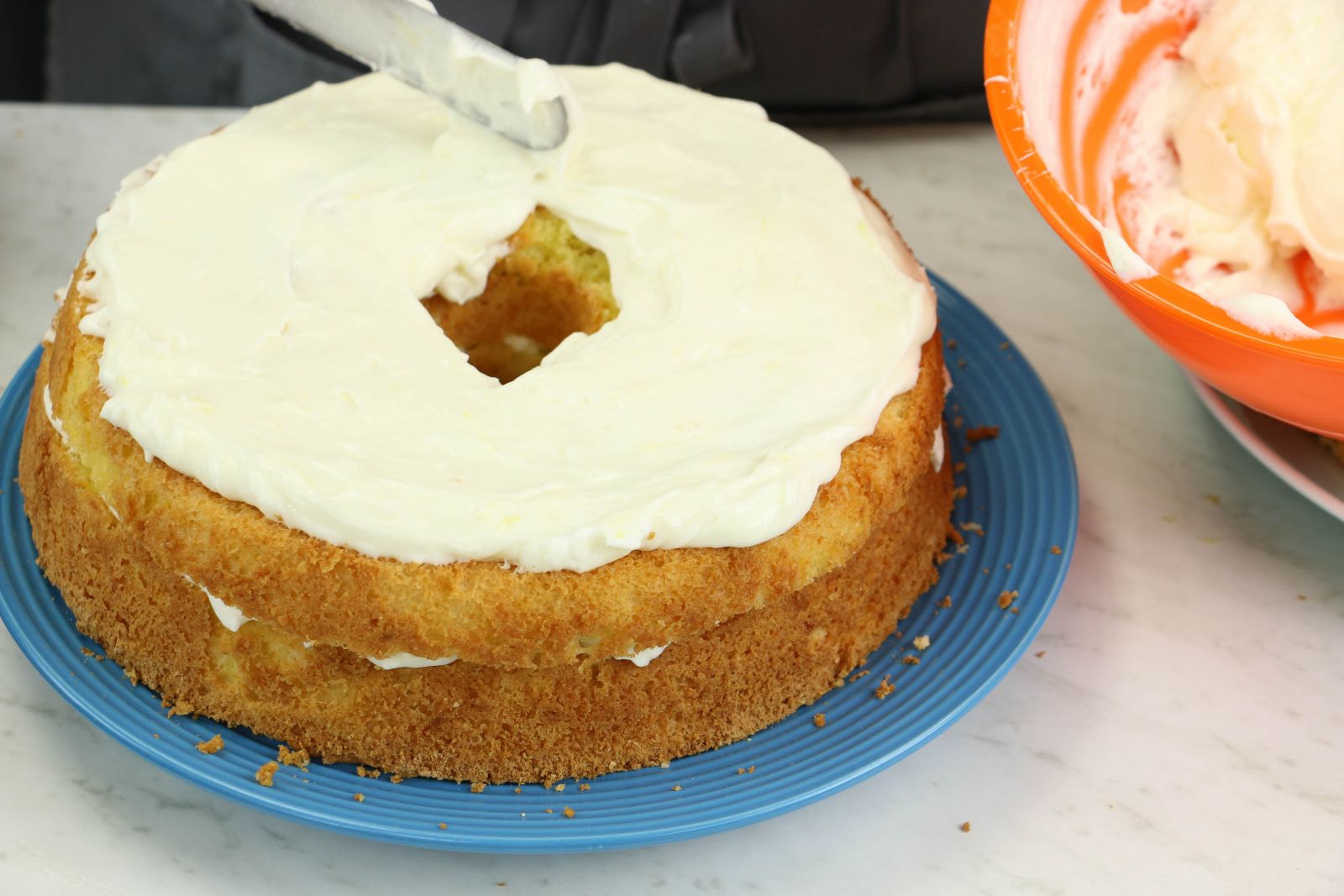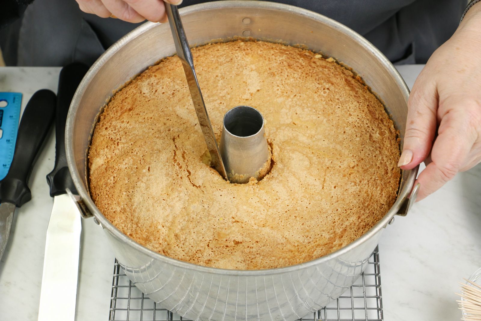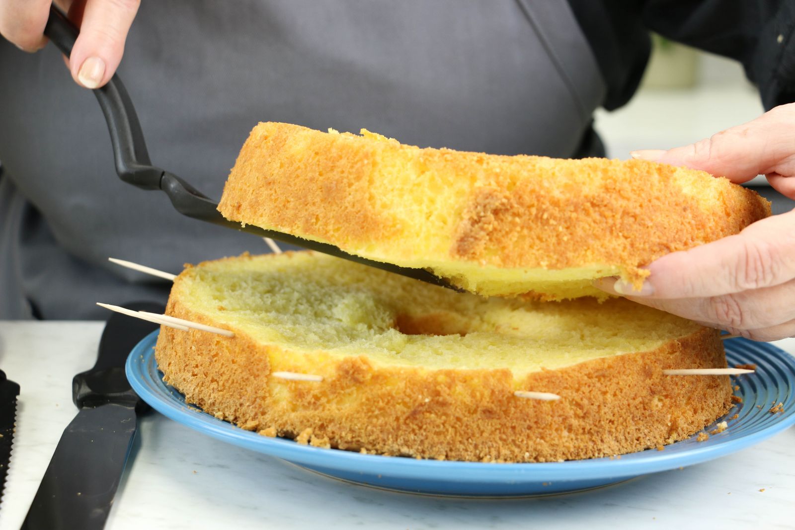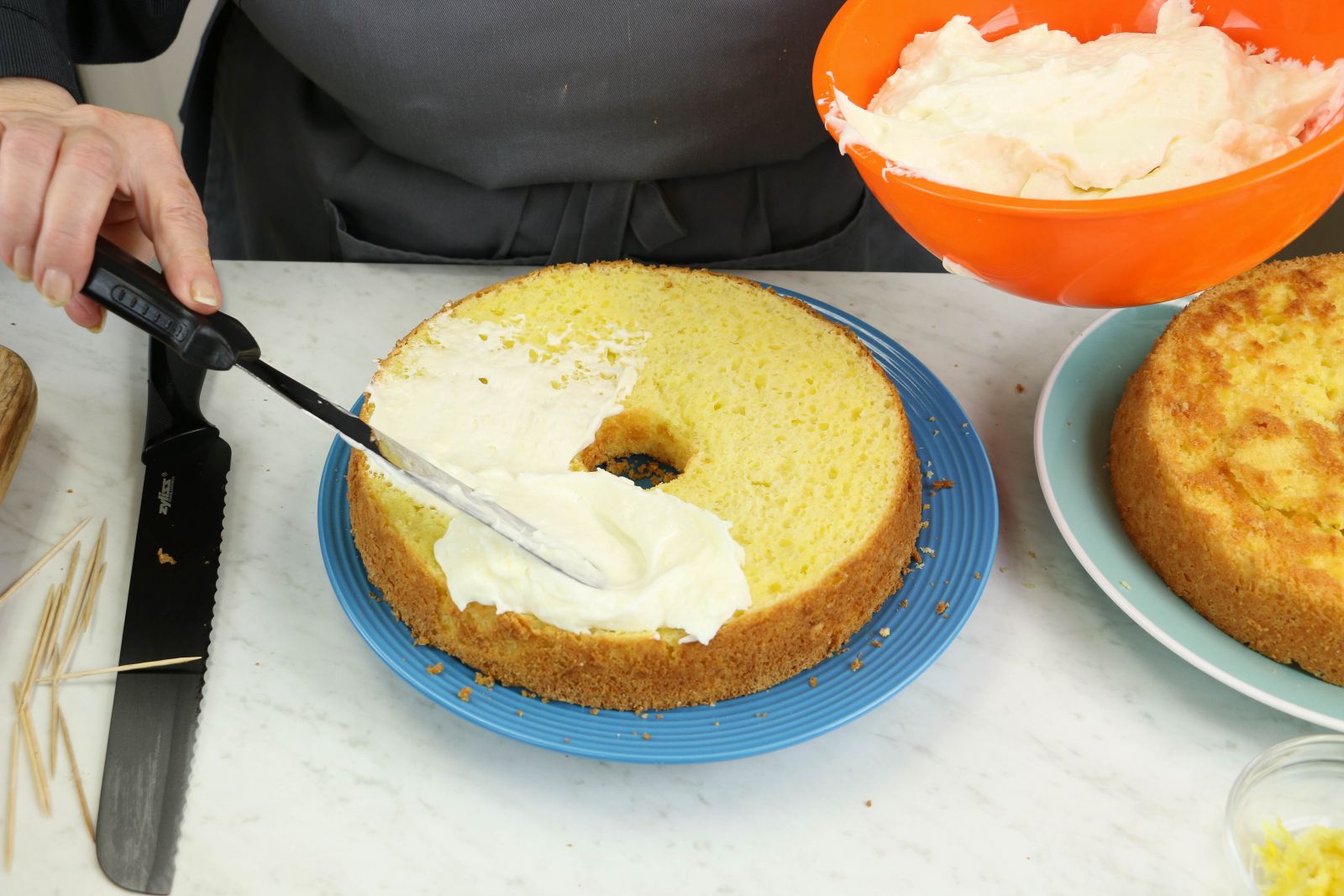 - When cake has cooled, use a table knife to run around the edges and the tube to loosen the cake, then tip it out onto a large plate. Use a serrated knife to cut the cake horizontally into 3 layers. Spread the filling between the layers and chill the cake.