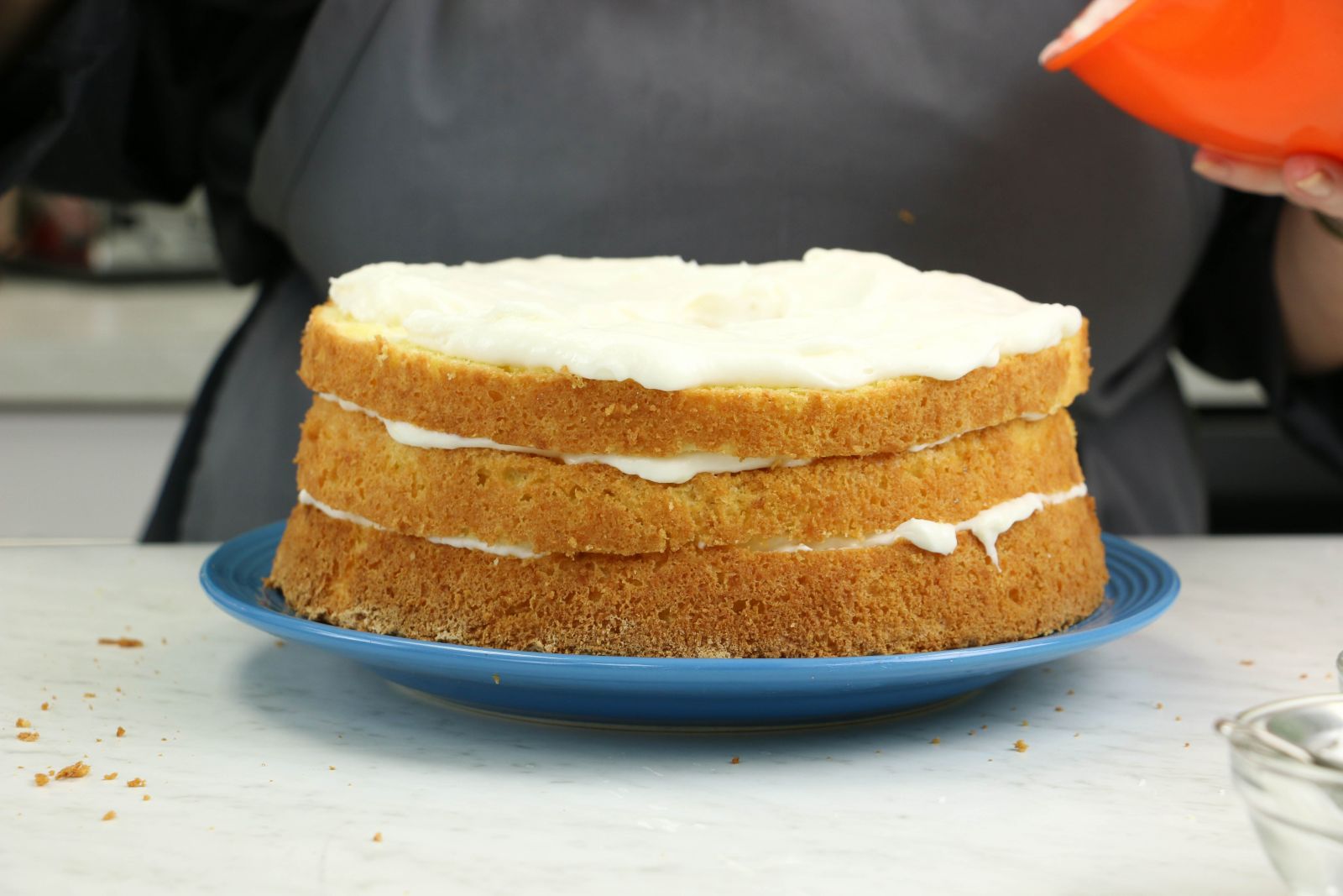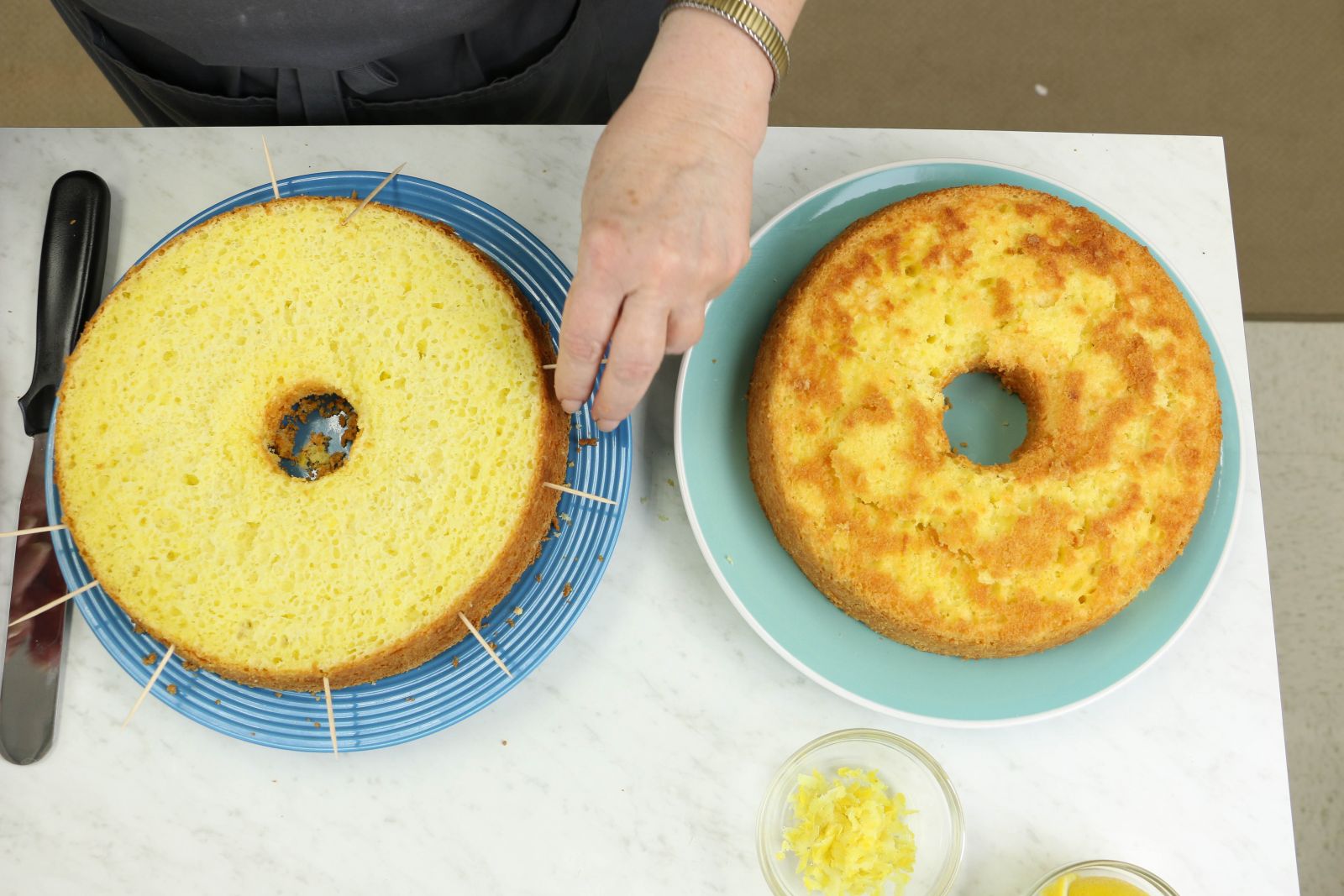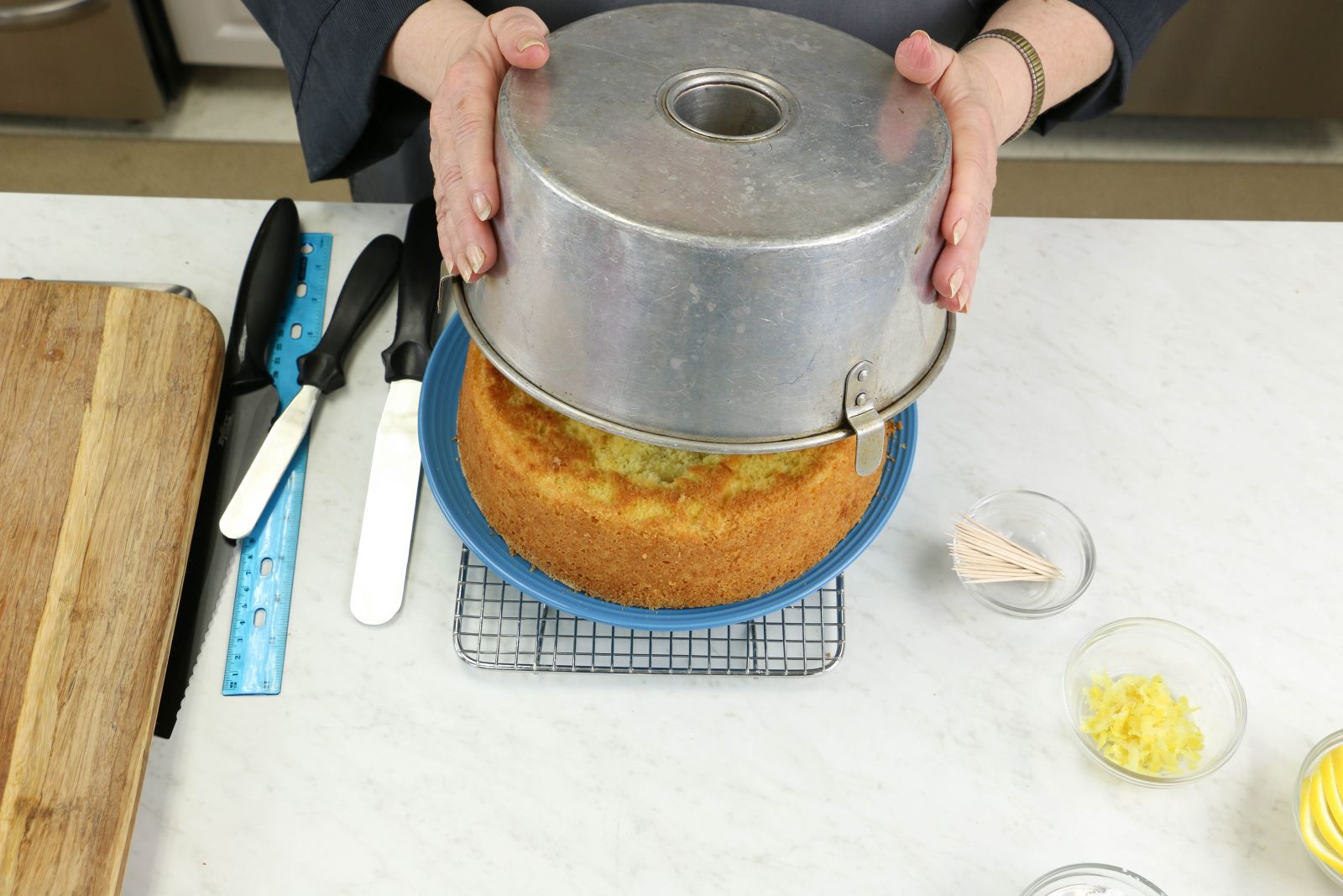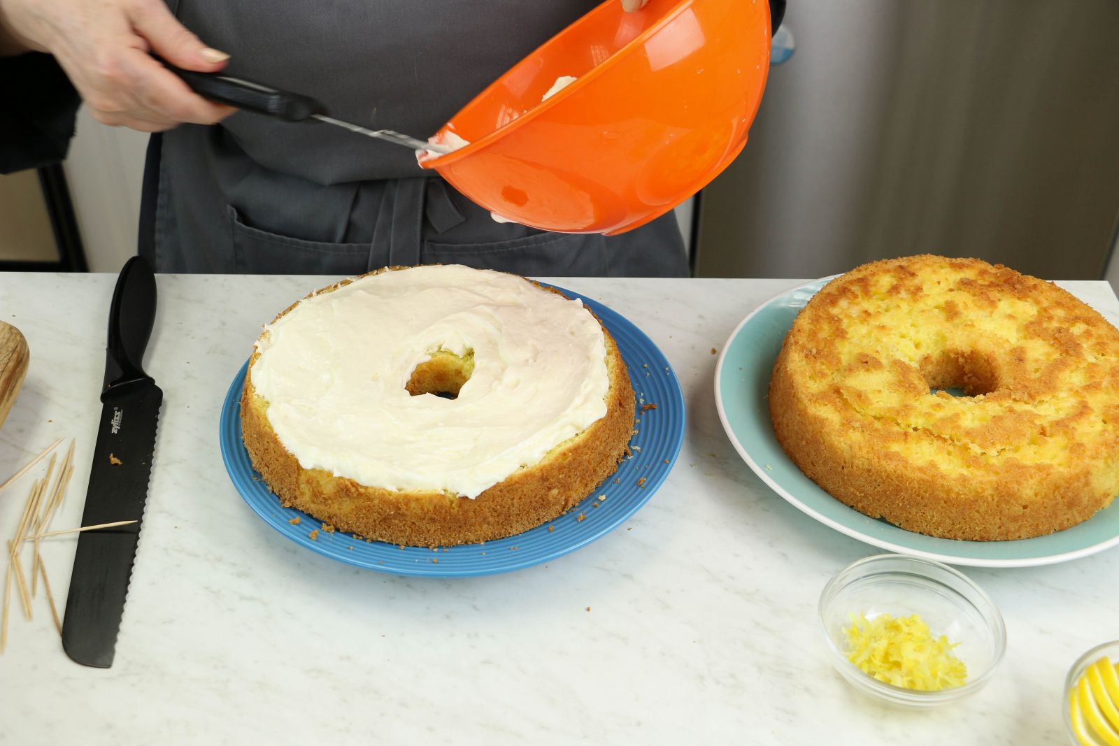 - When cake has cooled, use a table knife to run around the edges and the tube to loosen the cake, then tip it out onto a large plate. Use a serrated knife to cut the cake horizontally into 3 layers. Spread the filling between the layers and chill the cake.