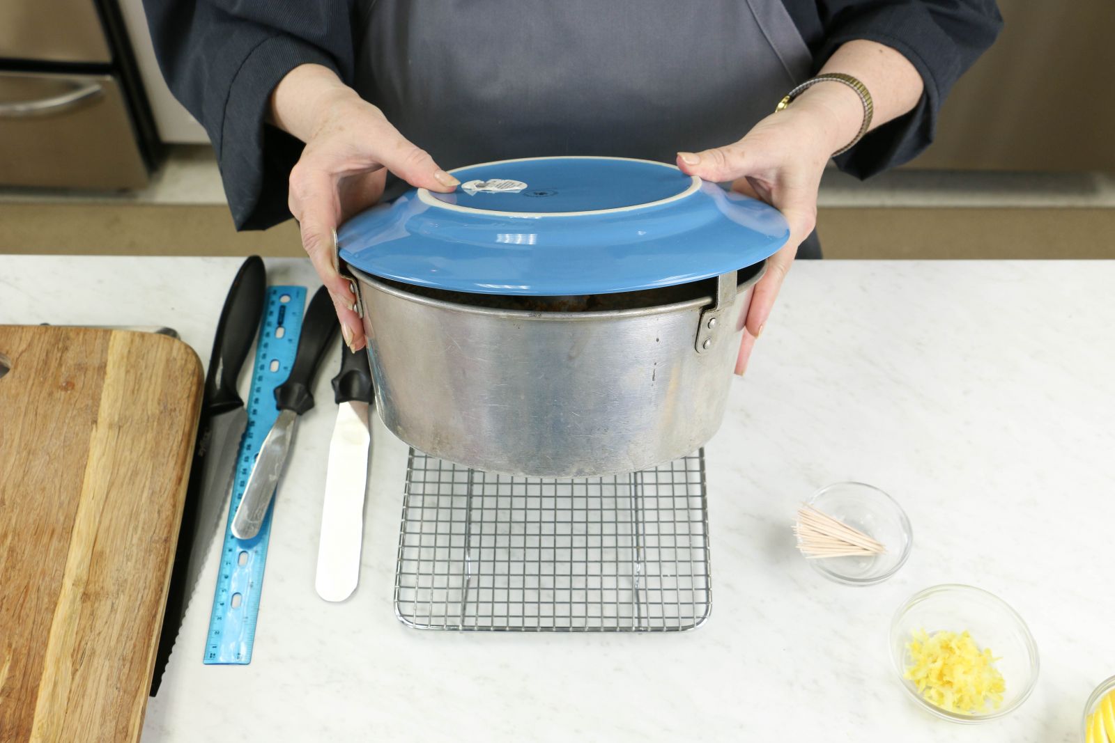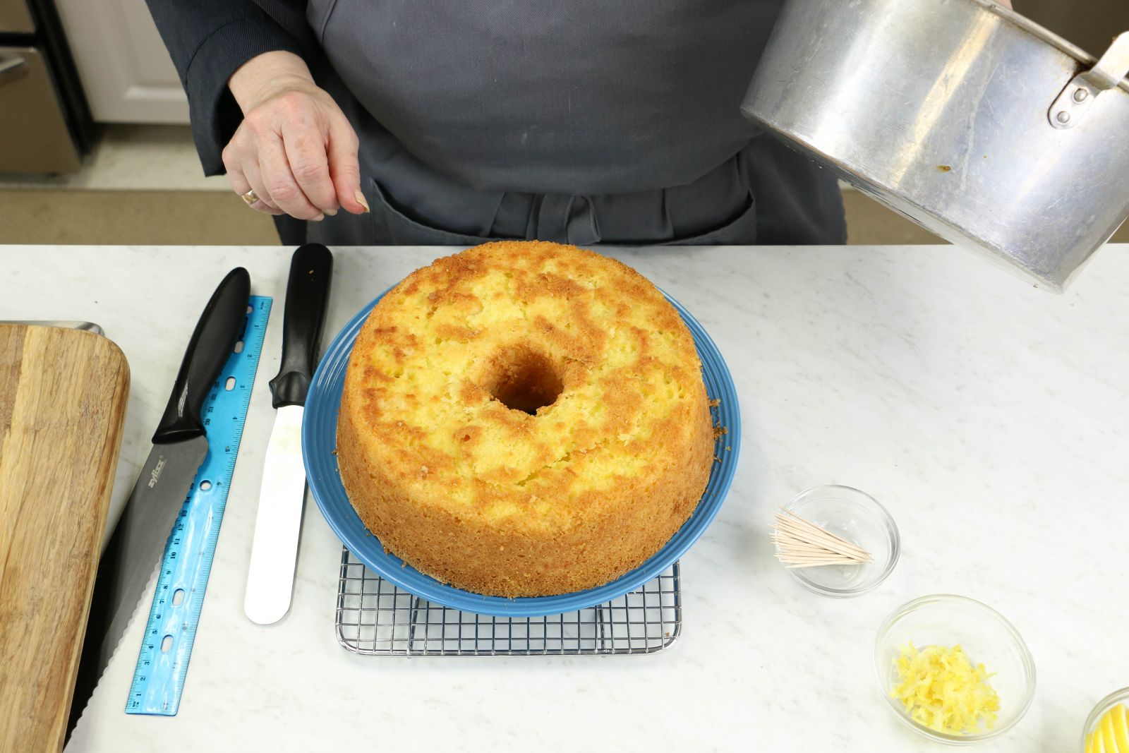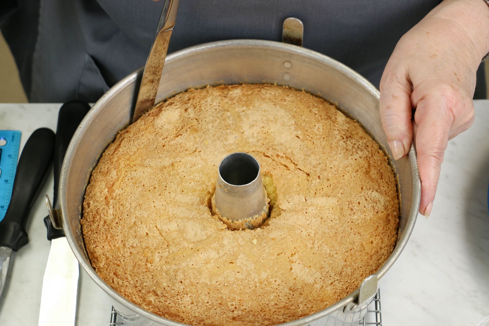 - Spoon batter into the cake pan and bake for 1 hour, until a cake tester inserted in the center comes out clean. Immediately turn the cake in the pan upside down and either rest it on the pans tabs or set it on top of a bottle neck until completely cool, about an hour. (See note)