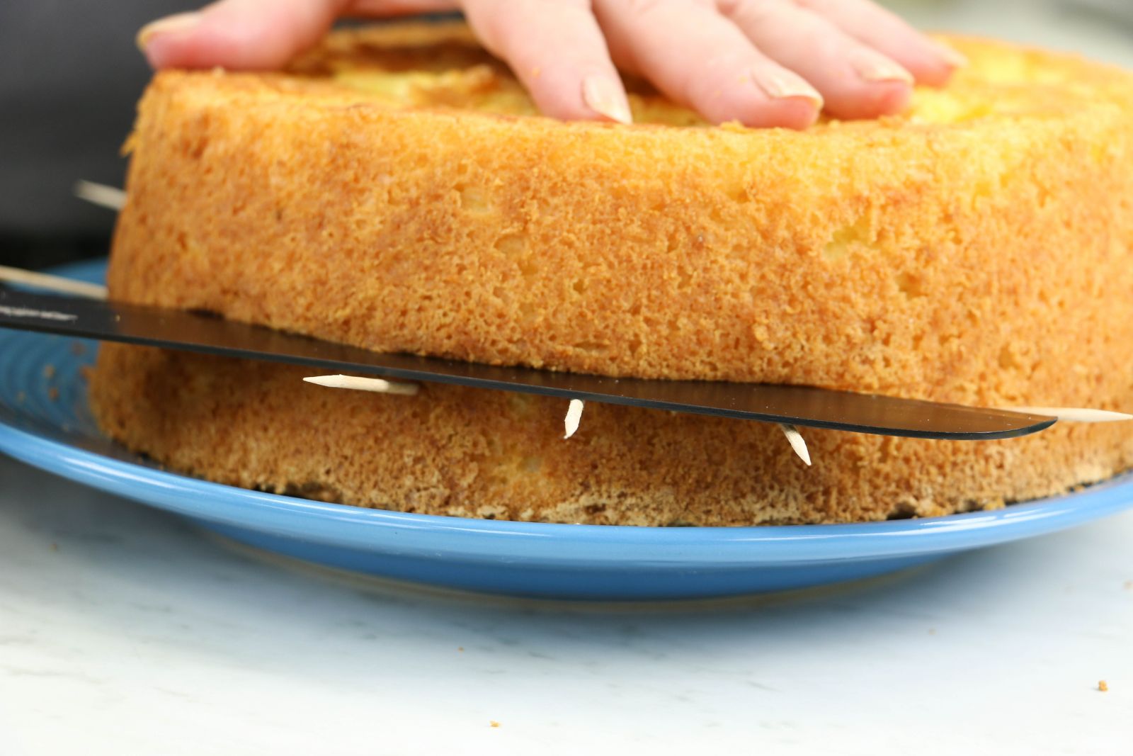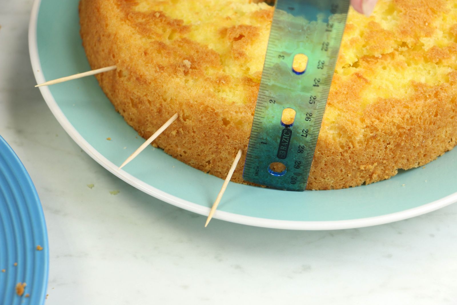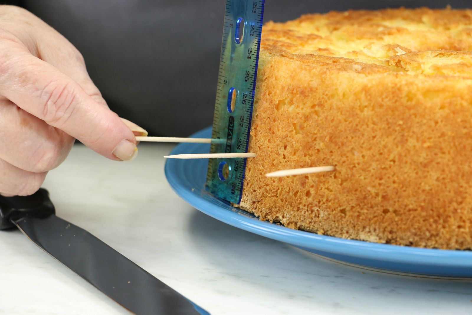 Next, you'll want to cut the cake in half, just above the toothpicks: