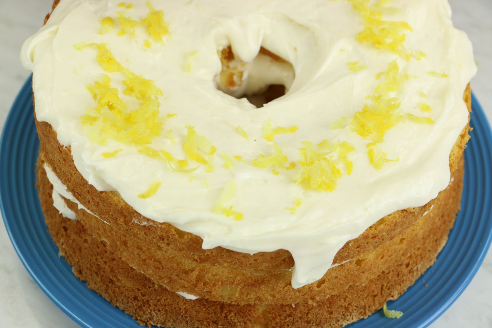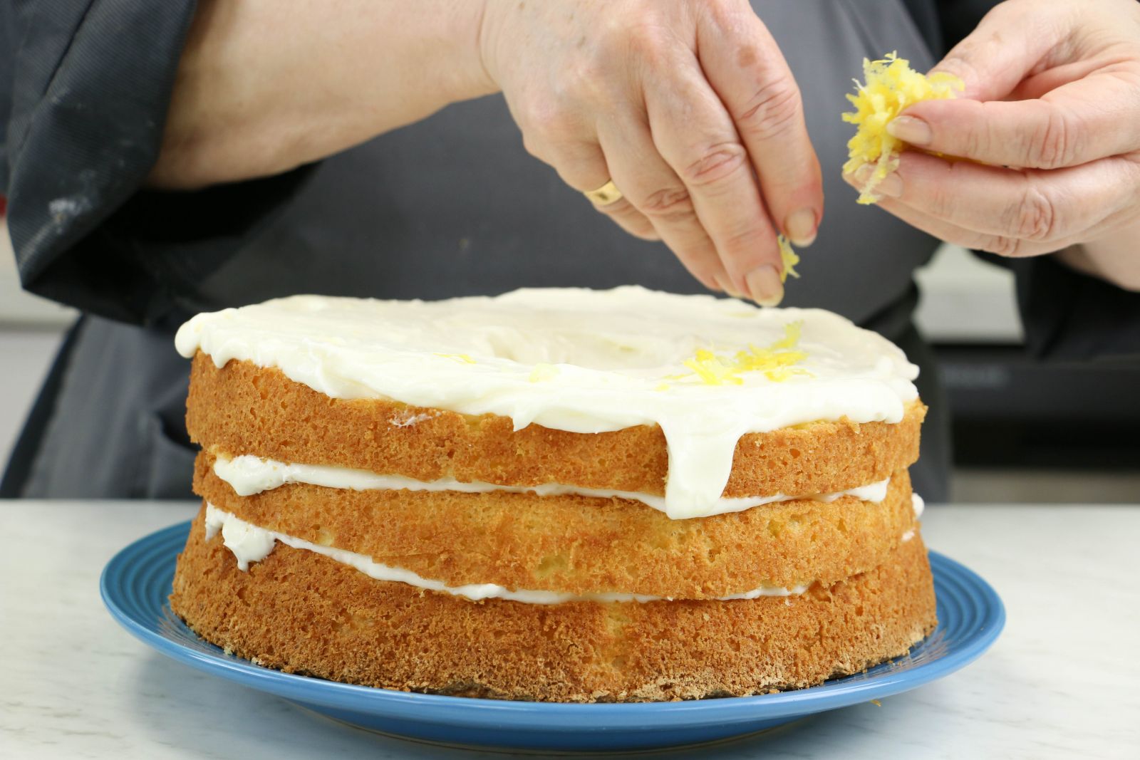 - While cake is cooling, prepare the filling: Use an electric mixer to whip the cream to firm peaks. In another bowl, whip the cream cheese until it is smooth. Add the lemon juice and zest, then slowly add the powdered sugar until completely mixed. Fold together the cream cheese mixture with the whipped cream and chill for 30 minutes before assembling the cake.