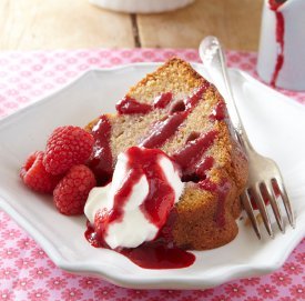 Boil and stir until the sauce is smooth and thickened. If desired, strain through a sieve or cheesecloth to remove the seeds. Serve the cake with the raspberry sauce.