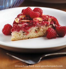 - Arrange raspberries, open ends up, over sugar mixture; sprinkle with almonds. In a bowl, combine remaining ingredients except garnish.