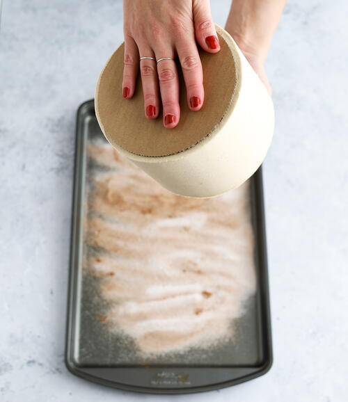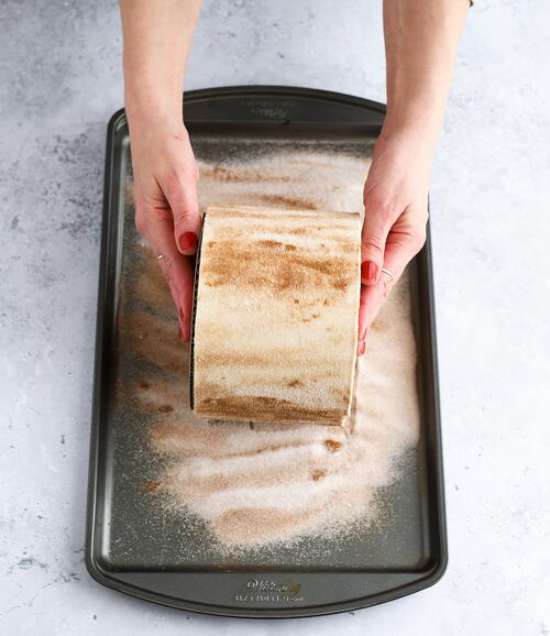 Turn the cake so that it is horizontal instead of vertical and gently roll the cake over the baking sheet to cover it in the Cinnamon-Sugar Topping, holding it with both hands the entire time. Keep rolling the cake, shaking the baking sheet to disperse the cinnamon sugar between rolls, until the sides are covered.