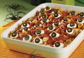 With mozzarella cheese and black olive "eyeballs," this cheesy pasta bake is not your average dinner dish. Perfect for Halloween, this crowd-pleasing dish from Campbell's Kitchen looks spooky but tastes delicious. There's nothing quite like wowing your dinner guests with wild and wacky easy casserole recipes like this one!