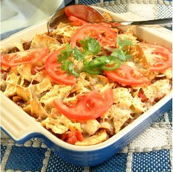 What do you think? Crush the tortilla chips, lay on bottom of baking pan, add meat mixture, then cheese, crushed chips ,meat, chesse etc. I use colby and monteray jack cheese or yo can use the mexican mix cheese.