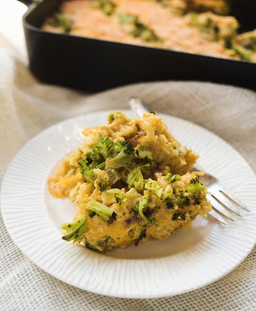 Our broccoli rice casserole uses frozen broccoli and Velveeta, making it crazy quick to throw together!