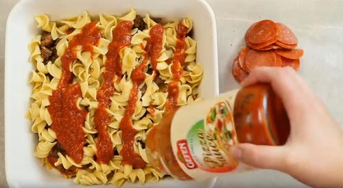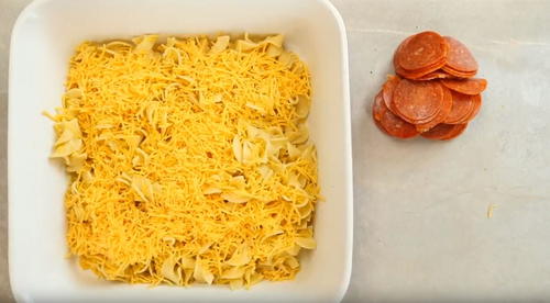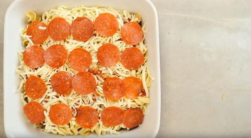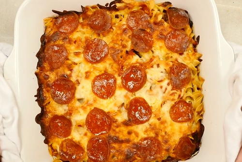 Pizza casseroles are becoming such a new food trend. I was a little curious about the egg noodles until I read the editor's note, so please use egg noodles or some kind of noodle base! Also, if you don't have these toppings in your house already, feel free to mix and match- add some frozen veggies or a few different types of cheese for a different flavor every time.
