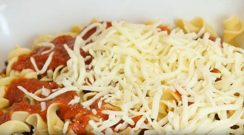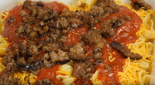 Second layer half the cheese over the noodles. Then half the pasta sauce, meat, and the rest of the noodles.