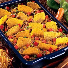 - Layer half of broken taco shells on bottom of greased 12 x 8-inch baking dish. Cover with half of meat sauce; sprinkle with 1 cup cheese.