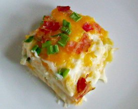 If you like pasta and mashed potatoes, this is the casserole for you. Instead of actually making pierogis, this recipe is easier and has all the flavors. For a healthier version of this dish, I would use turkey bacon, lite cream cheese spread, and reduced fat shredded cheese. To ensure that the pasta has a good consistency in the casserole, the lasagna noodles should be drained while they are still underdone because they will continue to cook in the oven.