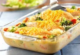 This one-dish wonder from Campbell's Kitchen features moist, tender chicken breasts covered with melted Cheddar cheese, sitting on a bed of creamy rice and vegetables. Easy casserole recipes just doesn't get any better. Plus this whole recipe costs less than $10!