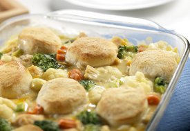 Pressed for time? This delectable easy chicken casserole recipe has everything you're looking for! With this Homestyle Chicken and Biscuits dish from Campbell's Kitchen you'll get chicken, veggies, biscuits, and a cheesy creamy sauce... all ready to serve in just 45 minutes! Look no further because you've just found the perfect easy recipe for chicken and biscuits.