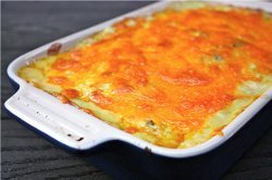 - Pour the mixture over the top of the broccoli and chicken and top with grated cheese.