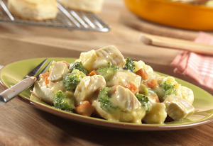 Stir the soup and vegetables in the skillet. Reduce the heat to low. Cover and cook for 5 minutes or until the chicken is cooked through. Serve the chicken and sauce over the biscuits.