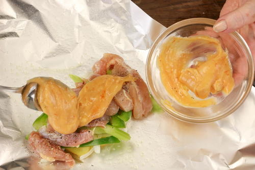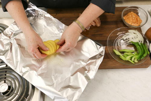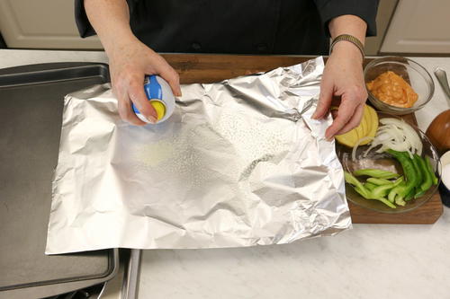 Preheat oven to 400. Cut four pieces of foil 12x18-inches and coat one side lightly with cooking spray.
