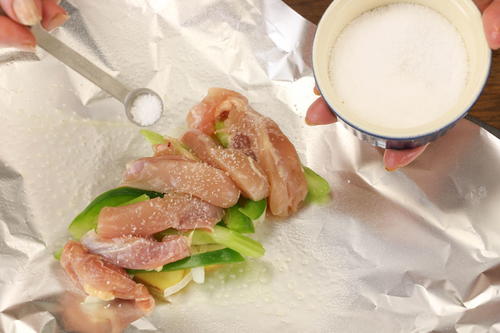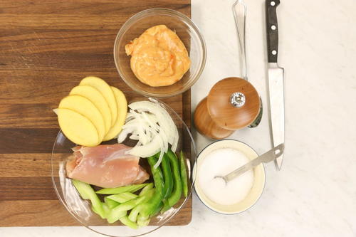 On each piece of foil, layer potatoes, vegetables and chicken in that order. Sprinkle with salt and pepper, and then spoon over the soup mixture. Fold and seal the foil with the seam on top, and place packets on a baking sheet to bake for 30 minutes.