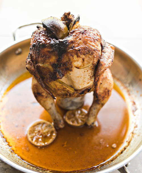 Rub the entire chicken well with olive oil. Press the remaining spice mixture into the skin all over.