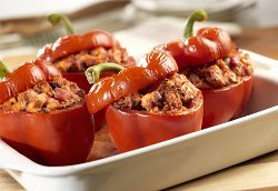 Tip: Cut a thin slice from the bottoms of the peppers to keep them from rolling in the dish.