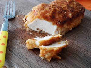 Remove a chicken breast from the buttermilk and allow excess to drip off. Place chicken breast in the crumb mixture. Turn and press to coat. Repeat for each chicken breast.
