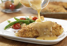 Crushed dry stuffing mix makes this chicken really crunchy and flavorful, the perfect main dish the whole family will love. Aside from the great flavor and texture, this Crunchy Chicken and Gravy recipe takes just 45 minutes from start to finish. You can't beat quick, easy chicken recipes like this one from Campbell's Kitchen.