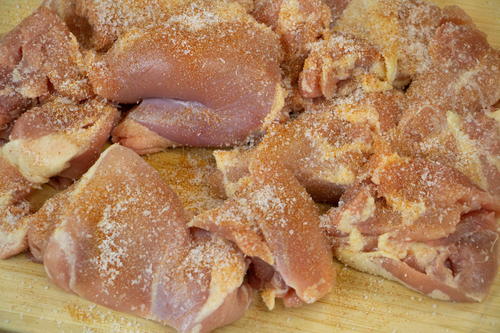 Lay the chicken thighs out on a cutting board and season with salt, pepper, cayenne, and garlic powder.