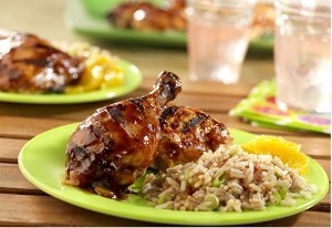 Cook the rice according to the package directions without salt. Stir in the reserved 3/4 cup picante sauce mixture and the onions. Serve the rice with the chicken. Garnish with the orange slices and thyme, if desired.