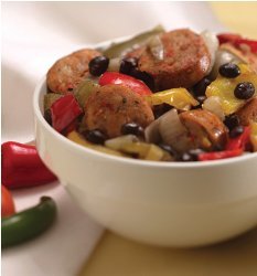 - Slice al fresco chicken sausage and sauté with oil, onions, peppers, and garlic.