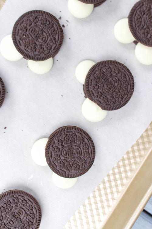 Slide the "ears" into place in between the cookies into the filling and dip the cookies in the melted white candy.