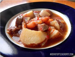 Cook for four to five hours until meat is cooked. Stew may be thickened with cornstarch if desired.
